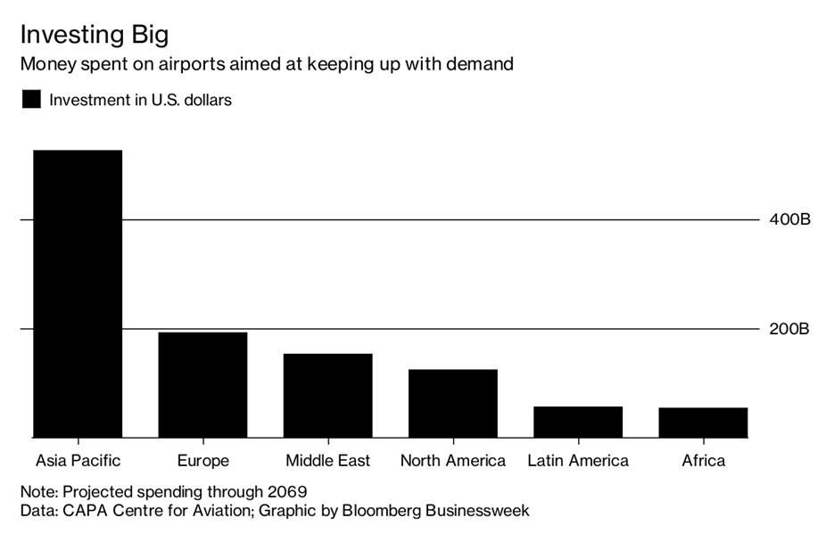 ووفقًا لتكهنات مركز “CAPA” لدراسات الطيران، فإن نصف هذه الاستثمارات المقدرة تقريبًا سيتركز في تطوير أو بناء مطارات جديدة في منطقة آسيا.